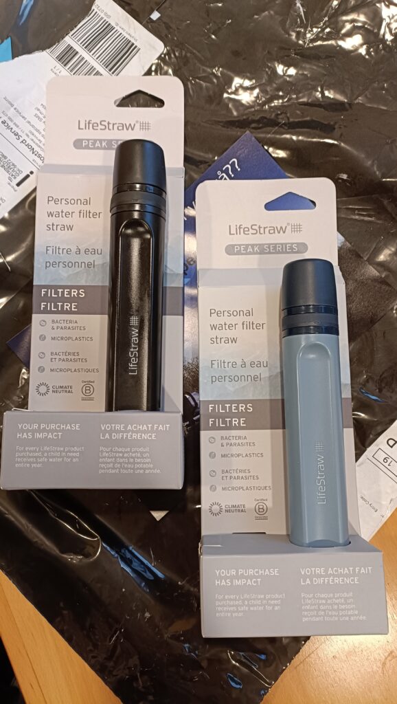 I forhold til vand har vi også været ude og investere i to Life Straw vandfiltreringssystemer, i tilfælde af at vi skulle løbe tør. Det giver os mulighed for om nødvendigt, at drikke vand fra naturen og få det renset på stedet.